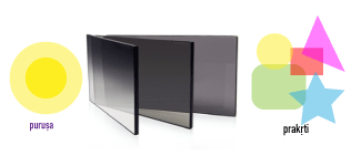 De un lado está la realidad que percibimos (PRAKṚTI), con la luz de todos los seres, que como la nuestra no deja de brillar, del otro nuestra luz (PURUṢA). Justo en el medio estos «filtros» con los cuales nos protegemos, porque nuestra luz es de la misma naturaleza pero de un «carácter muy delicado» en nuestro imaginario.