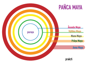 Las 5 capas se llaman (1) ANNA MAYA, (2) PRĀṆA MAYA, (3) MANO MAYA, (4) VIJÑĀNA MAYA y (5) ĀNANDA MAYA. Cada una tiene diferentes interpretaciones según el contexto, hasta incluso hay modelos de 7 capas, como propone BKS Iyengar en su libro Luz sobre los Yogasutras.