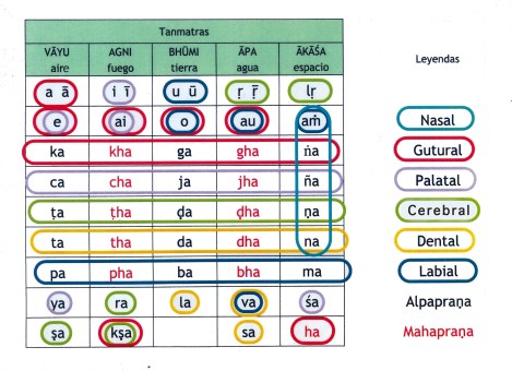 Cada sílaba tiene una fuerza o energía que contiene uno de los 5 elementos potenciales derivados de los Mahābhutas. Una palabra, así como cualquier objeto de nuestro mundo puede tener la combinación de ellos, y por lo tanto llevar su fuerza. Los podemos organizar según la siguiente tabla.