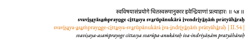 “pratyāhāra es [cuando] (pratyāhāraḥ) los sentidos (indriyāṇāṁ), se desconectan (a-saṁ-pra-yoge) del dominio (svaviṣaya) de citta (cittasya), como si (iva) imitararan (anukāraḥ) su verdadera forma o naturaleza (svarūpa).”